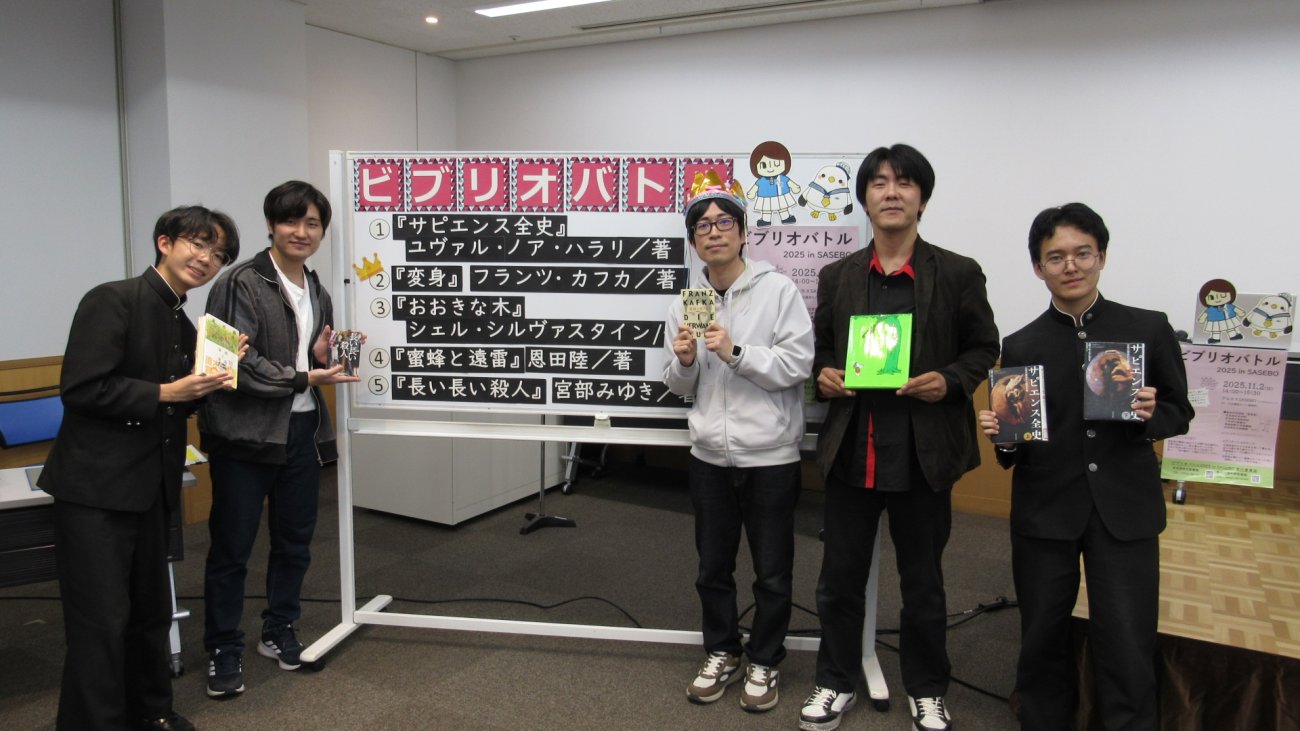 2025年11月2日(日)アルカスSASEBOにおいて、「ビブリオバトル 2025 in SASEBO」を開催しました。佐世保市立図書館と共催し、今回で8回目となります。佐世保市内の各団体から集まった5名のバトラー(発表者)がおすすめの本を紹介し、40名近くのオーディエンス(観覧者)から投票で選ばれたチャンプ本は『変身』(フランツ・カフカ/著)でした。