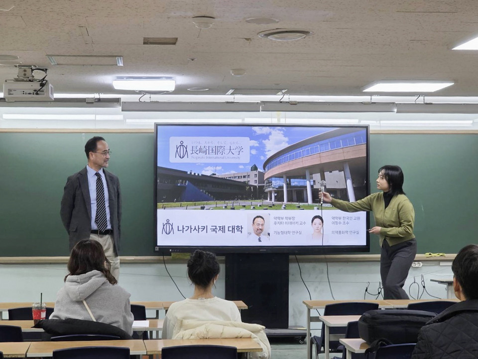 11/28 (금)에는 천안시에 위치한 본교와 협력 관계에 있는 강남SKY어학원 (원장: 최근택 (본교 객원 교수))이 일본 약학부 진학을 희망하는 한국 학생들을 대상으로 본교의 설명회를 개최하였습니다. 먼저 약학부 이정수 조수가 본교 약학부의 개요를 한국어로 소개했습니다. 이어 약학부장 후지타 히데아키 교수의 모의수업(「기능형태학・자율신경에 대하여(퀴즈 포함)」)이 진행되어, 강남SKY어학원에서 공부 중인 26명의 한국 학생들이 일본어로 대학 강의를 체험했습니다.