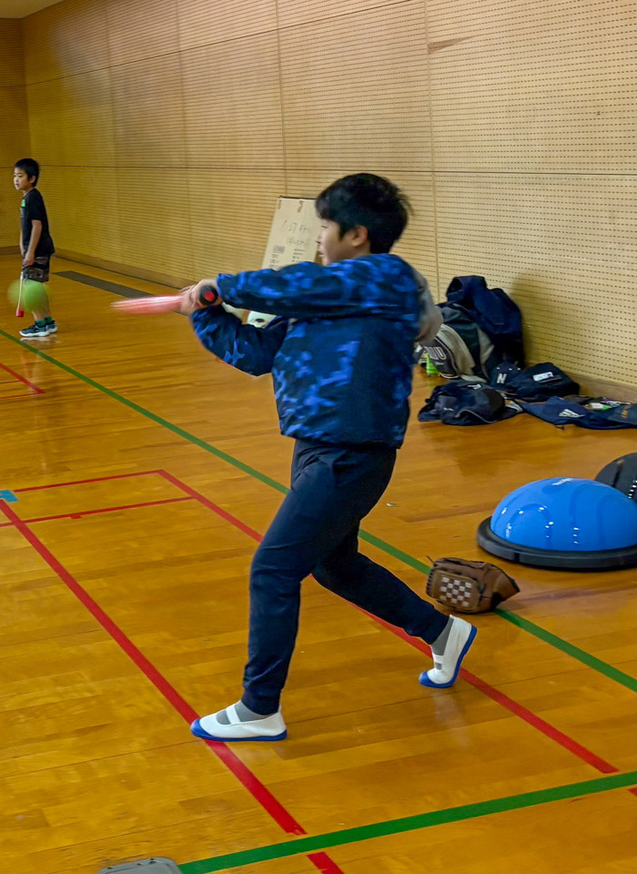 今回は、小さいボールや道具を使用する「野球・ソフトボール・テニス」などの種目の基礎になる動作を体験しました。野球部員やソフトボール経験者の学生がサポートし、子ども達は短時間でどんどんコツをつかみ、楽しみながら自信をつけていきました。学生にとっても素晴らしい経験になりました。