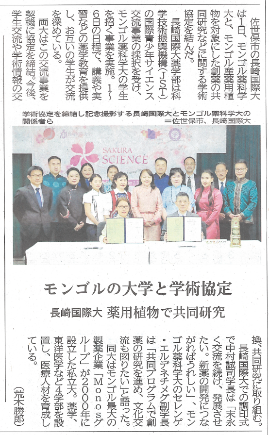 なお、本学とモンゴル薬科学大学との交流および本協定締結の様子は、長崎新聞ならびにテレビ佐世保の取材を受け、地域メディアを通じて広く紹介されました。
