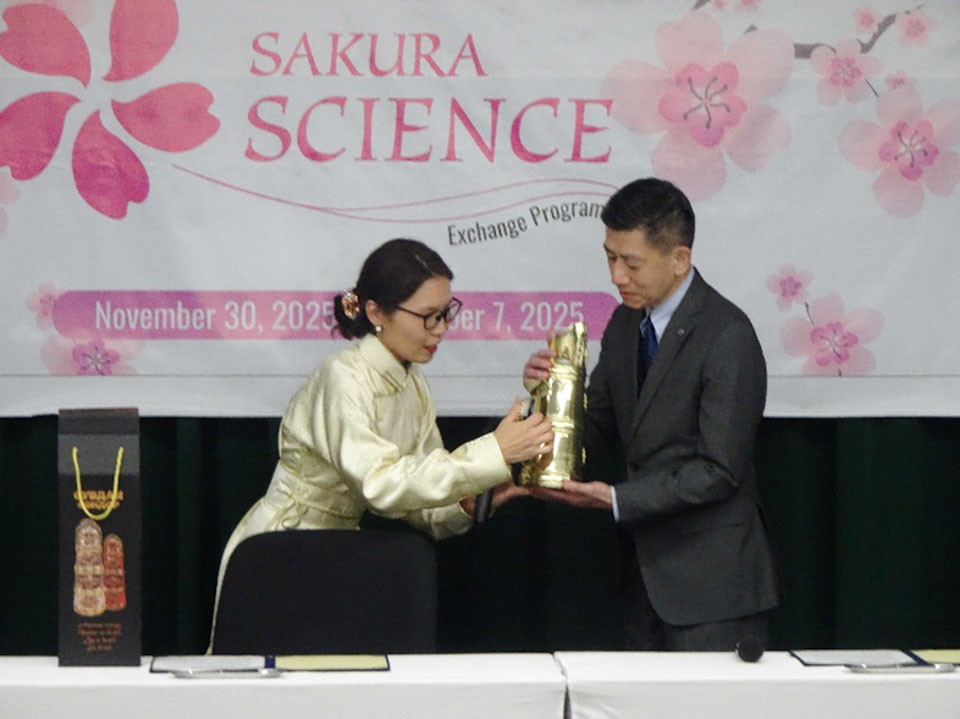 調印式では、本学薬学部の宇都教授によるこれまでの交流経緯の説明に続き、中村学長およびErdenechimeg副学長が協定書に署名しました。署名後には記念品の贈呈が行われ、今後の学術・教育交流のさらなる発展に向けた期待が、両大学間で共有されました。