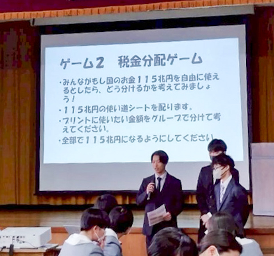 今回の租税教室も、①基本的な税の知識を知るクイズ、②税金分配ゲーム、③税名ビンゴの3本立てで実施しました。40名を超える生徒が参加しましたが、クイズではこれまで習った内容を思い出しながら、税金分配ゲームでは理由までしっかりと考えながら、税名ビンゴでは税の名前をしっかりと考えながら、租税教室に臨んでいました。学生も学内での準備をしっかりと活かして授業を行うことができました。