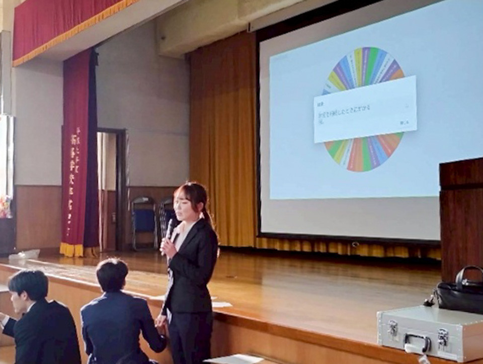 国際観光学科では中高の社会・保健体育・英語の教員免許を取得することができ、毎年多数の教員免許取得者がいます。少人数ゼミにおいて、学外での活動も通しながら専門性を高めていきます。浦郷ゼミでは、2022年度から佐世保法人会様のご協力のもと、租税教室を中学校で実施させていただいております。