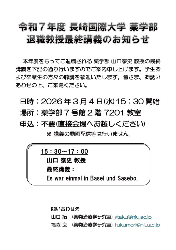本年度をもってご退職される薬学部 山口泰史 教授の最終講義を下記の通り行いますのでご案内申し上げます。学生および卒業生の方々の聴講を歓迎いたします。