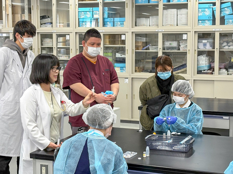 実習体験ではガウンを着用して、病院薬剤師の業務の一つである輸液の調製を、注射器を用いて行いました。また、薬局薬剤師が現場で使用する軟膏板を用いて、軟膏の調製を体験しました。保護者の方からは、薬剤師を目指したい高校生は多く、このような企画がもっとあると良いという意見がありました。