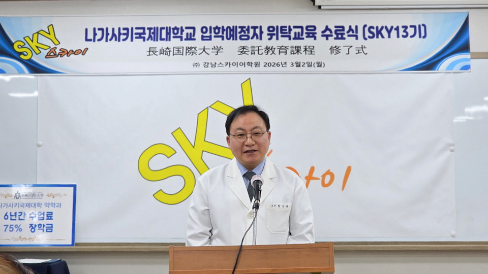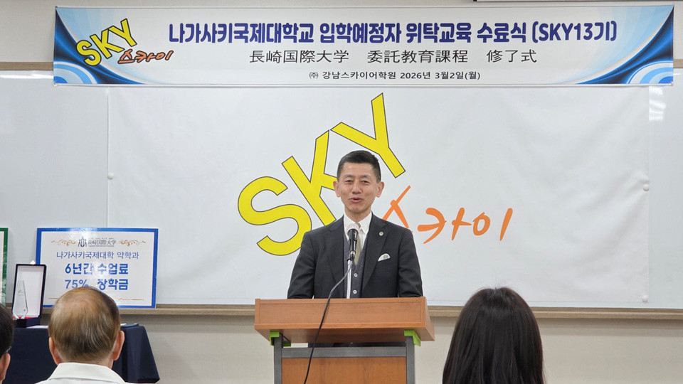 2026년 3월 2일에 SKY어학원 수료식이 개최되어, 본교 약학부 2차 시험에 합격한 5명의 수료생과 그 학부모, 일본어 교육을 담당한 SKY어학원 교직원들이 참석했습니다. 본교에서는 나카무라 세이지(中村誠司) 총장과 후지타 히데아키(藤田英明) 약학부장이 참석했습니다. 나카무라 총장은 "일본에서의 학업이 힘들겠지만, 약사가 되겠다는 목표를 잊지 말고 대학 생활을 즐기기 바란다."라는 축사를 전했습니다. 수료생들은 최근택 원장이 직접 전달한 수료증을 손에 들고 자랑스러운 모습으로 식전에 임했습니다.