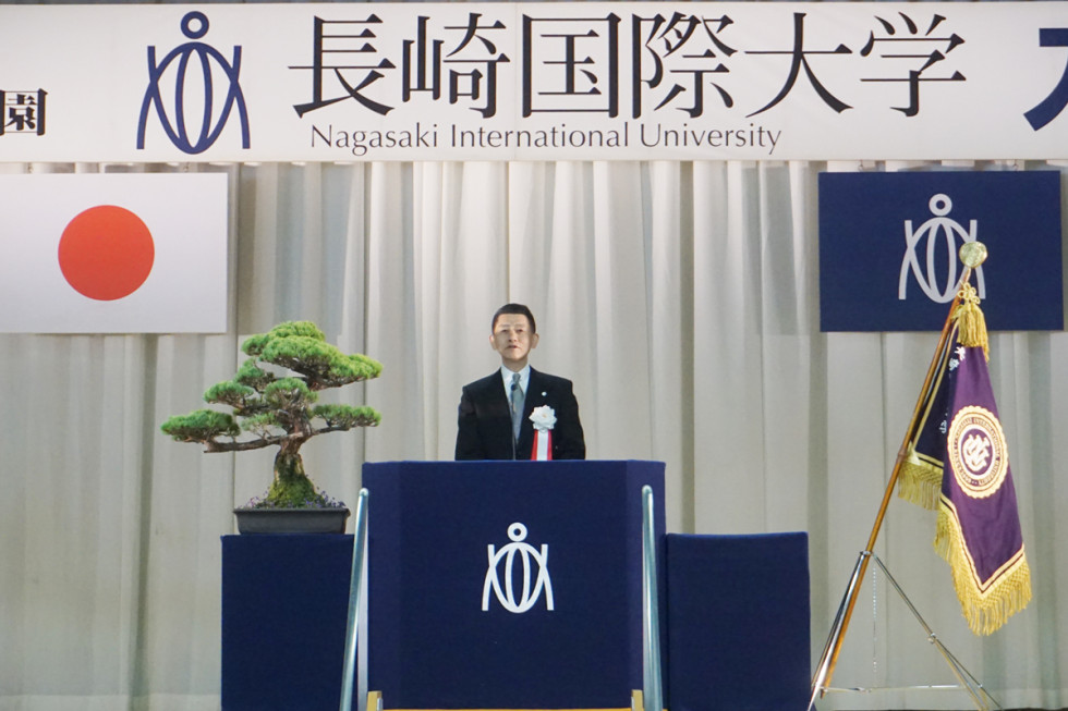 式典の開催にあたりご協力いただきました保護者ならびにご家族の皆様に深く感謝申し上げます。新入生の皆さま、ご入学おめでとうございます。皆さまのご入学を心より歓迎するとともに、長崎国際大学での4年間ないし6年間の学生生活が、実り多き素晴らしいものとなるよう心よりお祈り申し上げます。