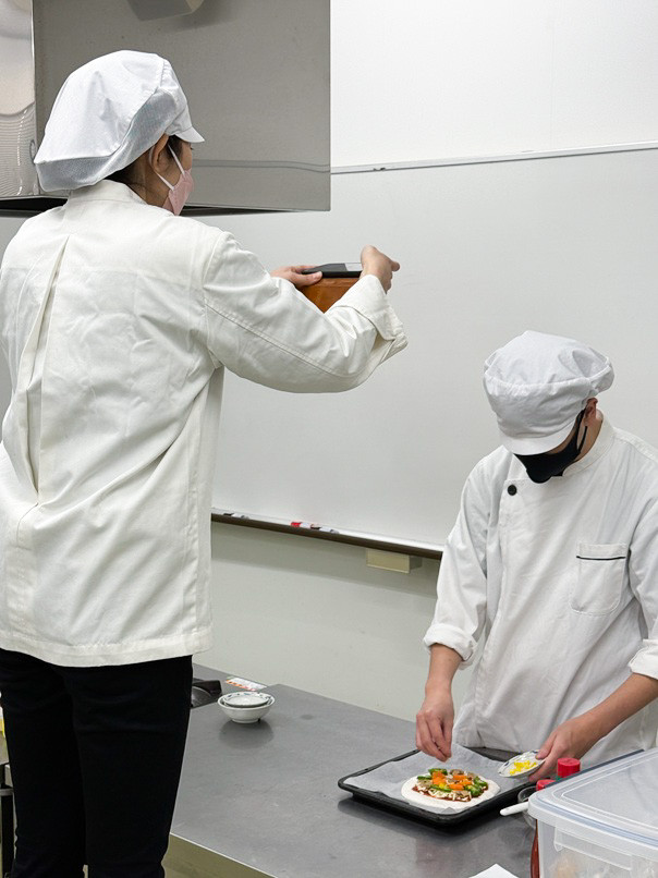 今回は、ピザを治療用特殊食品の低たんぱく質の素材を利用して、PKU向けの料理になるようにアレンジしたレシピをこの科目を履修する大学院生が考え、それを試作調理し、レシピ動画の作成まで行いました。